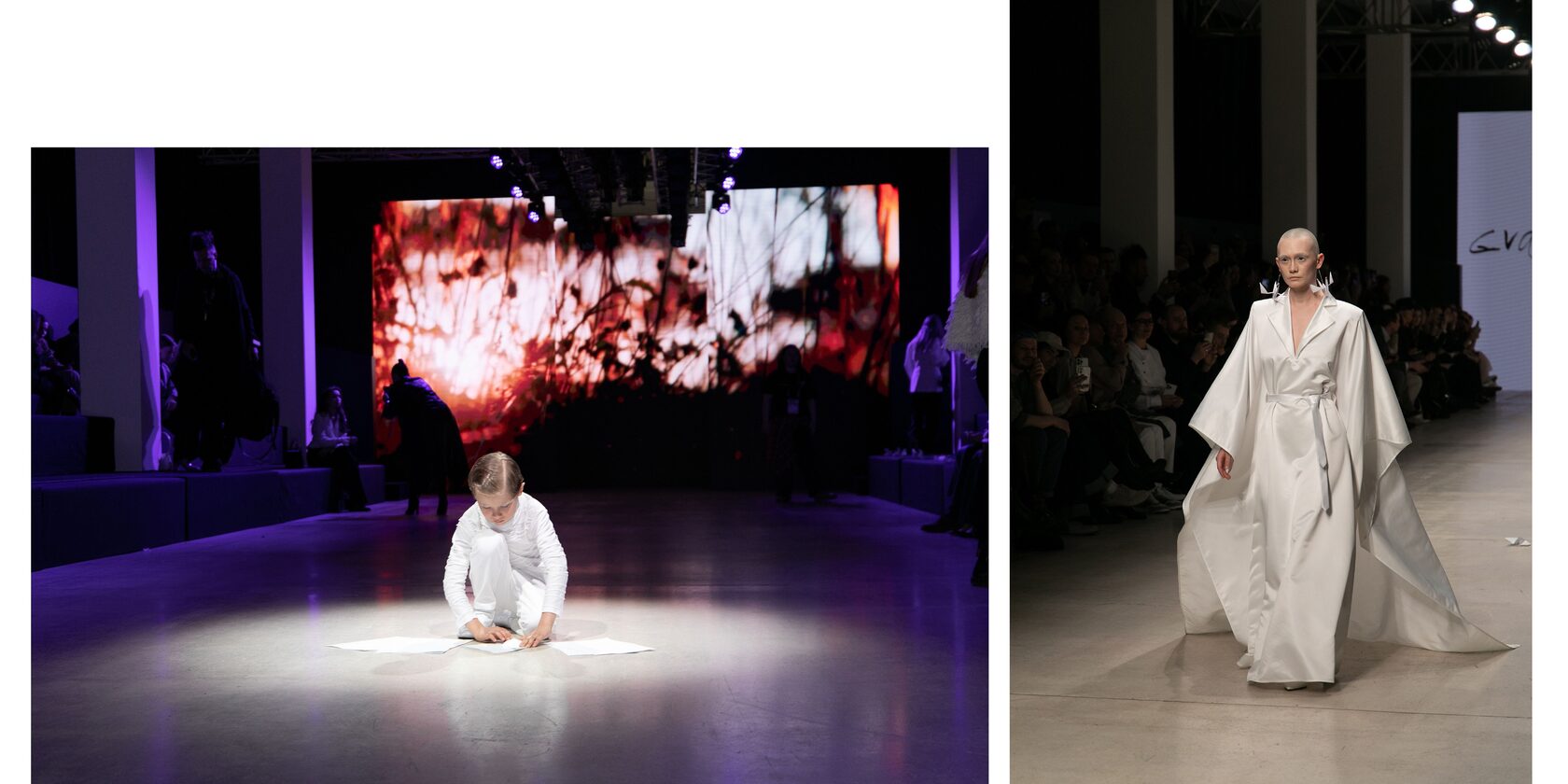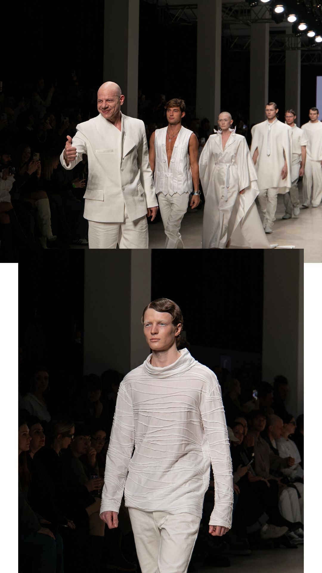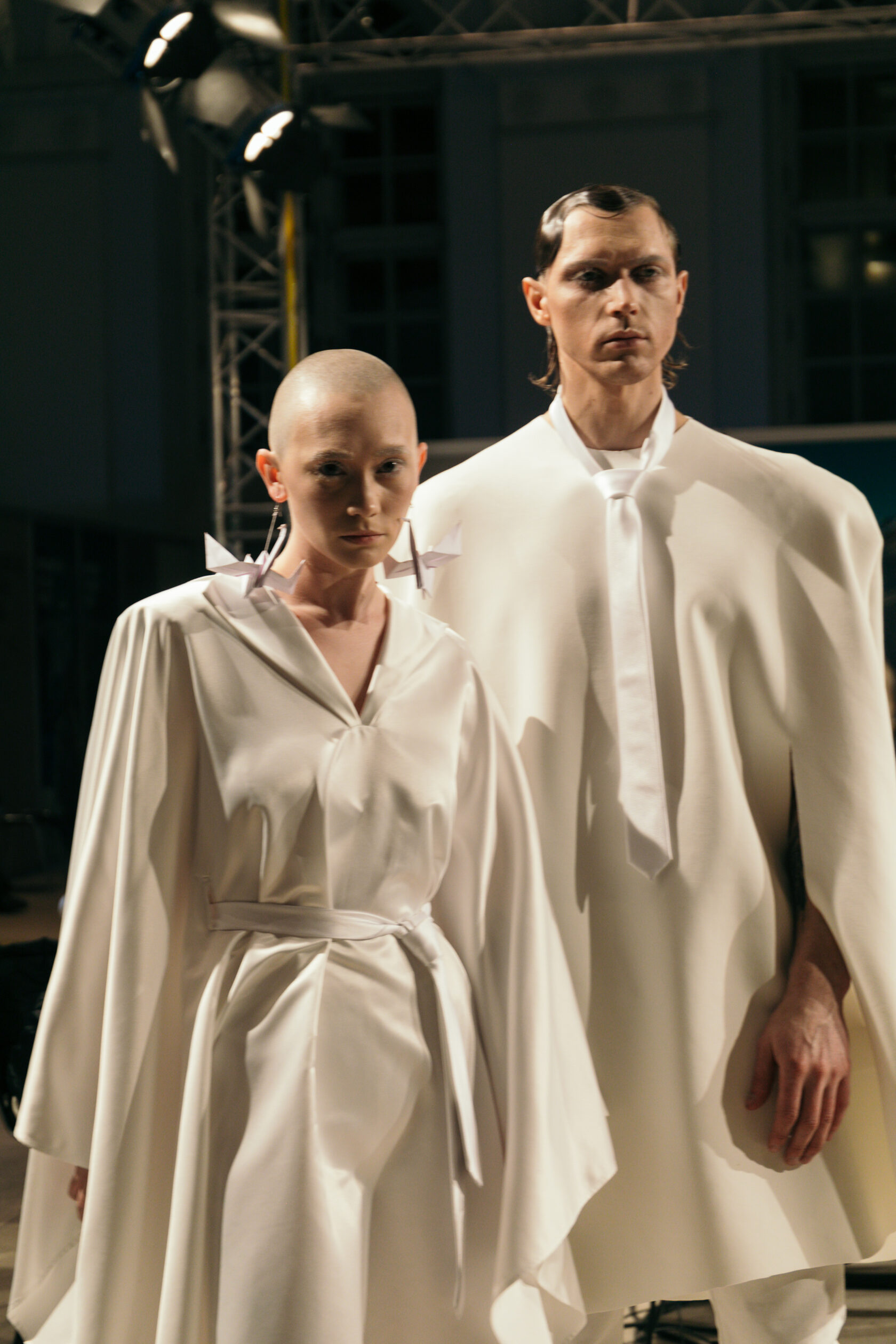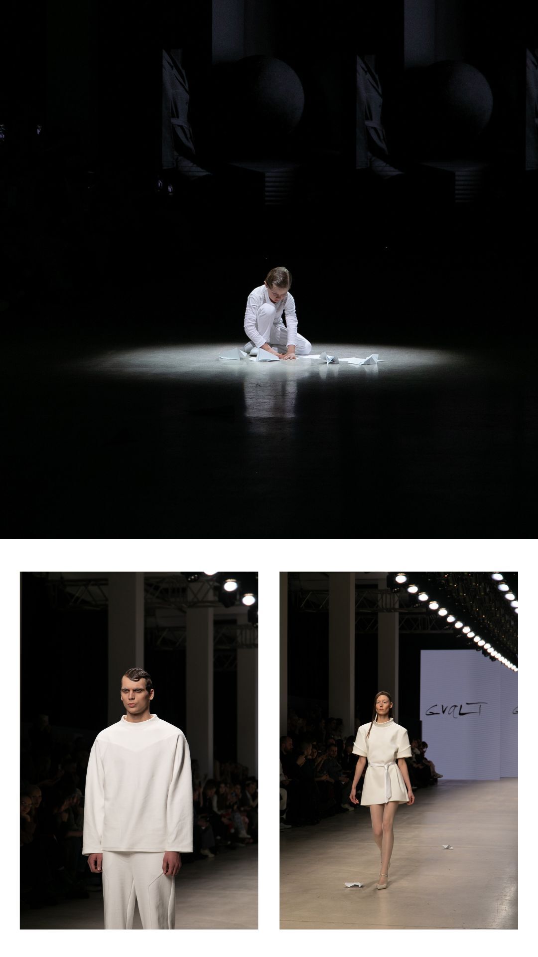 И тут мне пришла в голову мысль: оригами! Мой младший сын принимал участие в показе, я – мама, и мне приходится с ними играть, я знаю, что это такое. Оригами — это бумага, а здесь – ткань. Мы стремились создать из ткани подобие бумаги, некие фигуры, конструкции, превращающиеся в образ. Так и родилась коллекция, которая сегодня дебютировала».